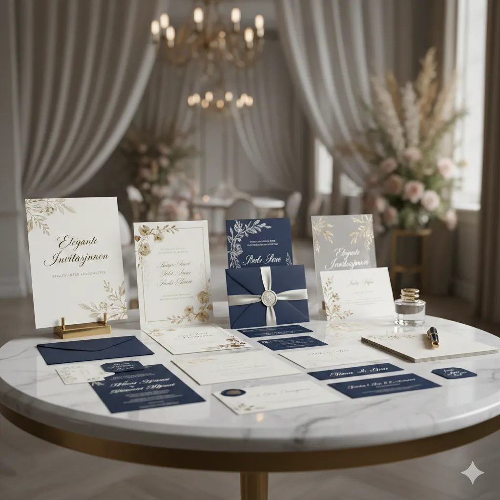 Alt-i-ett løsning som inkluderer invitasjoner, menykort, plasskort, takkkort og mer. Alle elementer er designet for å fungere sammen som en harmonisk helhet.