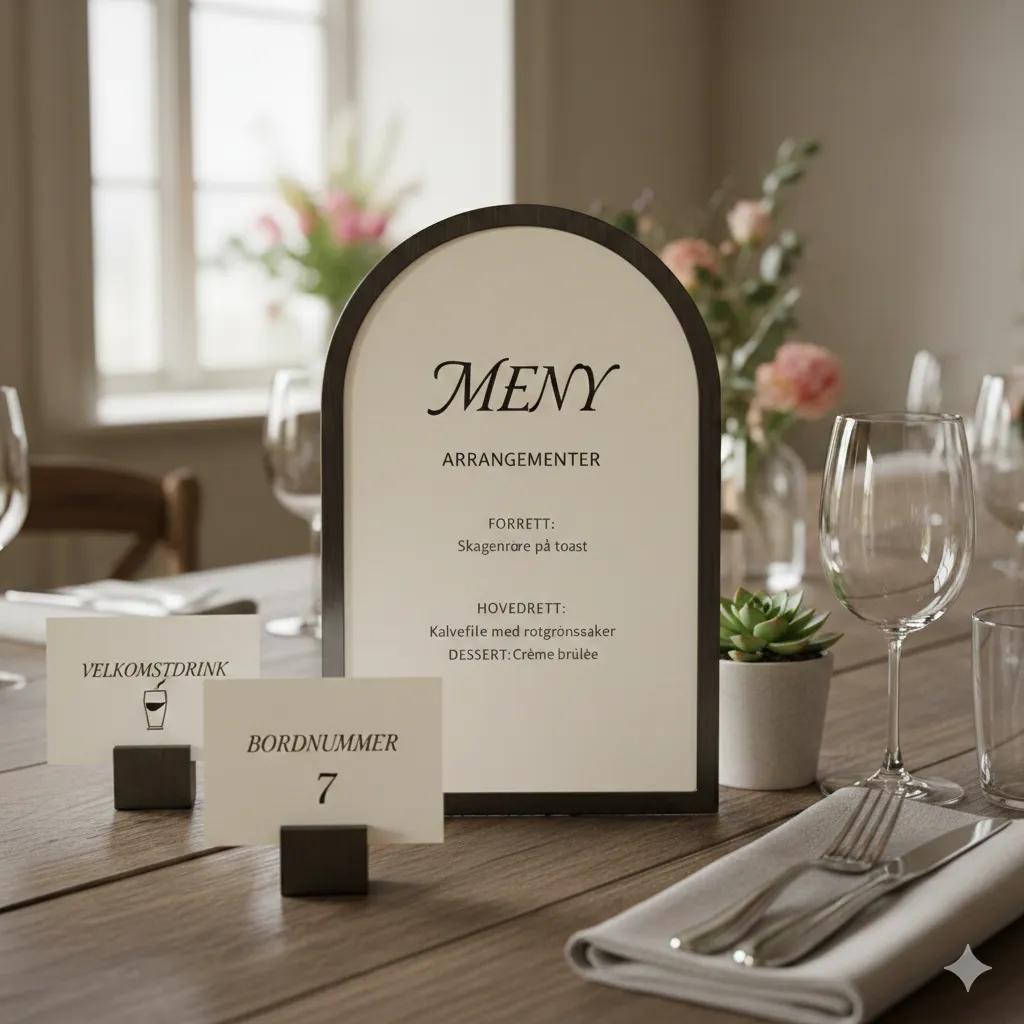 Profesjonelle menykort designet for å matche ditt arrangements tema. Tilgjengelig i ulike størrelser og stiler. Inkluderer både hovedmeny og dessertmeny.